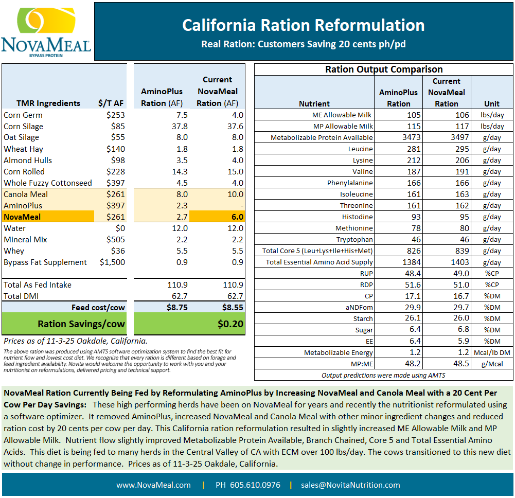 CALIFORNIA Original Ration vs. NovaMeal Ration: Shows a 20¢ savings per head per day by reformulating out AminoPlus and increasing both NovaMeal and Canola Meal (along with other slight reformulation adjustments). This California ration is being fed to several high performing herds in the Central Valley with ECM over 100 lbs/day. This reformulation resulted in slightly increased ME Allowable Milk and MP Allowable Milk. Nutrient flow slightly improved Metabolizable Protein Available, Branch Chained, Core 5 and Total Essential Amino Acids. These high performing herds have been on NovaMeal for years and the nutritionist reformulated using a software optimizer. The cows transitioned to this new diet without change in performance.